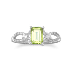 Rhodium plated sterling silver ring featuring a 4mm x 6mm peridot with a cutout marquise shape design encrusted in white topaz on each side. The band is approximately 1.5mm.