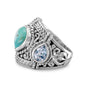 Gorgeous ornate oxidized sterling silver ring with two 5.5mm x 8.5mm pear sky blue topaz stones and a 8.5mm x 10.5mm pear reconstituted turquoise center stone. Available in whole sizes 6-10.