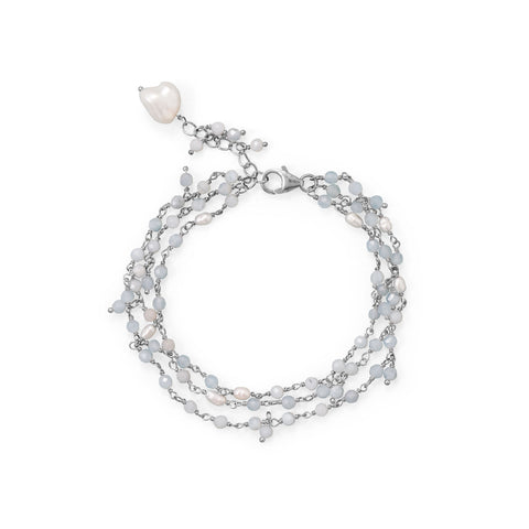 Look calm, cool and collected in this icy blue set! 7" rhodium plated sterling silver three strand bracelet with 1" extension features aquamarine and cultured freshwater pearls. Beaded aquamarine and pearls measure 2.8-4mm and largest pearl measures approximately 8.8mm x 9.9mm. This bracelet features a lobster clasp closure. Pearl size can vary.