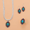 THE spring ring. Oxidized sterling silver ring has blue reconstituted turquoise, coral, lapis, and green and purple reconstituted turquoise. The center stone is 10mm x 7.5mm, 6mm x 4.5mm lapis, 5.5mm x 4mm coral, and 4.5mm green and purple turquoise. Available in whole sizes 6-9. Stone selection may vary.