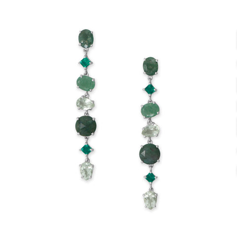 Rhodium Plated Green Multi Stone Long Drop Earrings