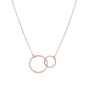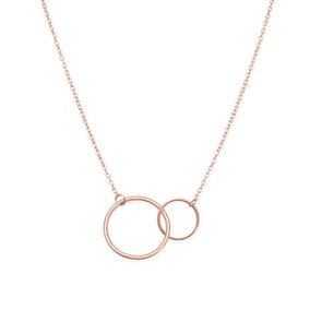 16" + 2" extension 14 karat rose gold plated sterling silver necklace with a small and large circle link center. The circles are approximately 10mm and 16mm. The necklace has a lobster clasp closure.