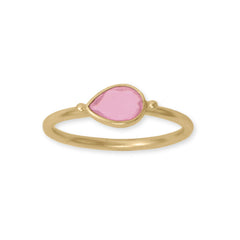 Stylish and stack worthy! 14 gold plated sterling silver ring features 7.5mm x 5.5mm pear shape pink glass. Available in whole sizes 6-9.