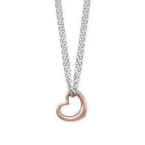 18" rhodium plated sterling silver double strand necklace with sliding 14 karat rose gold sterling silver open heart pendant that measures approximately 12mm x 14mm. This necklace has a lobster clasp closure.