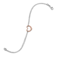 7.5" rhodium plated sterling silver double strand bracelet with sliding 14 karat rose gold sterling silver open heart pendant that measures approximately 12mm x 14mm. This bracelet has a lobster clasp closure.