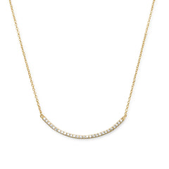 18" + 2" extension 14 karat gold plated sterling silver necklace with a 36mm curved CZ bar. The necklace has a lobster clasp closure.