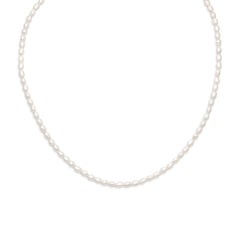 13" + 2" extension sterling silver and cultured freshwater rice pearl necklace with approximately 3.5mm x 5mm white rice pearls. This necklace has a lobster clasp closure.
